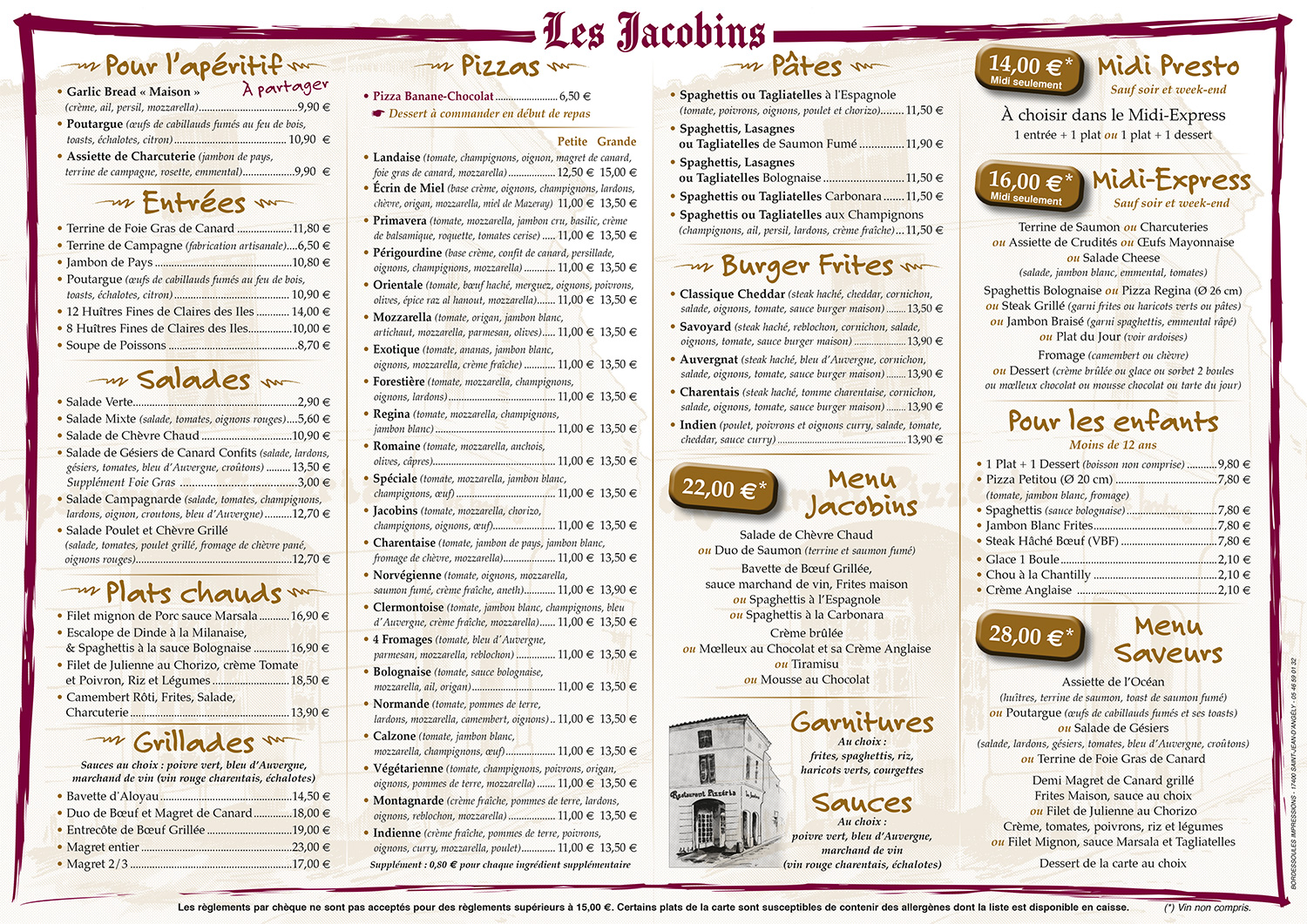 Que vous préfériez les pizzas débordantes de fromage ou plutôt les options végétariennes, une chose est certaine : vous serez conquis en venant dans notre restaurant ! Si vous souhaitez déguster de délicieuses pizzas riches et savoureuses dans un cadre agréable, rendez-vous au restaurant Les Jacobins.